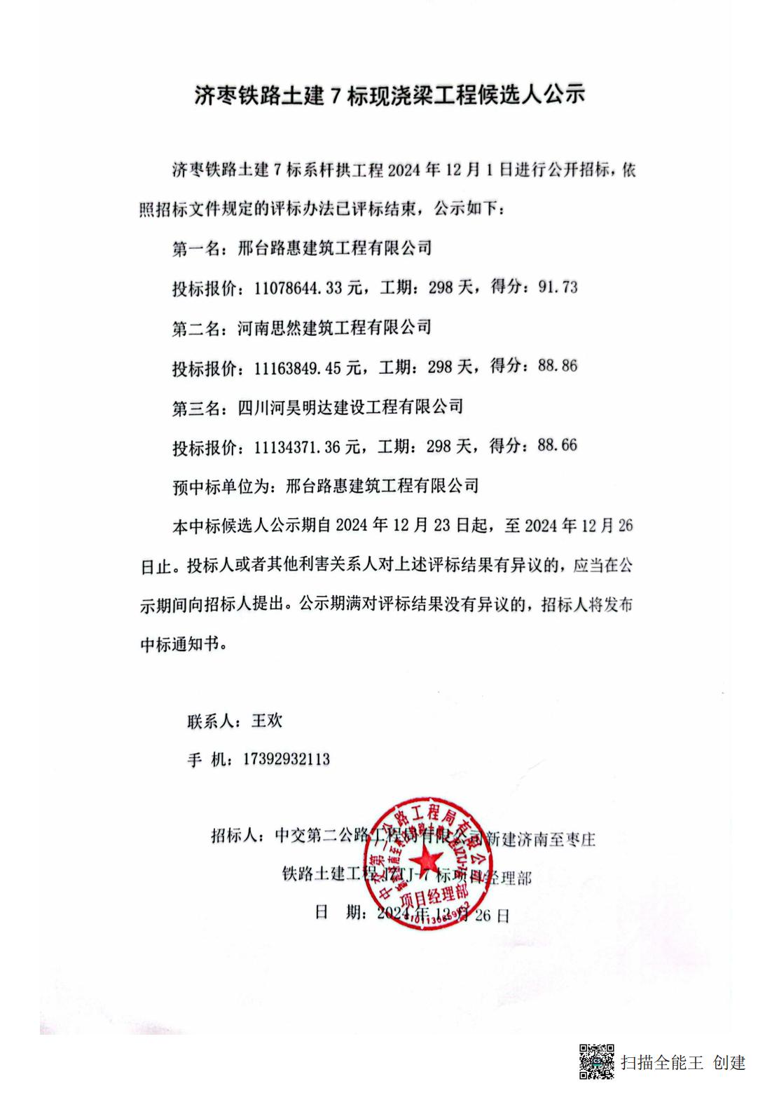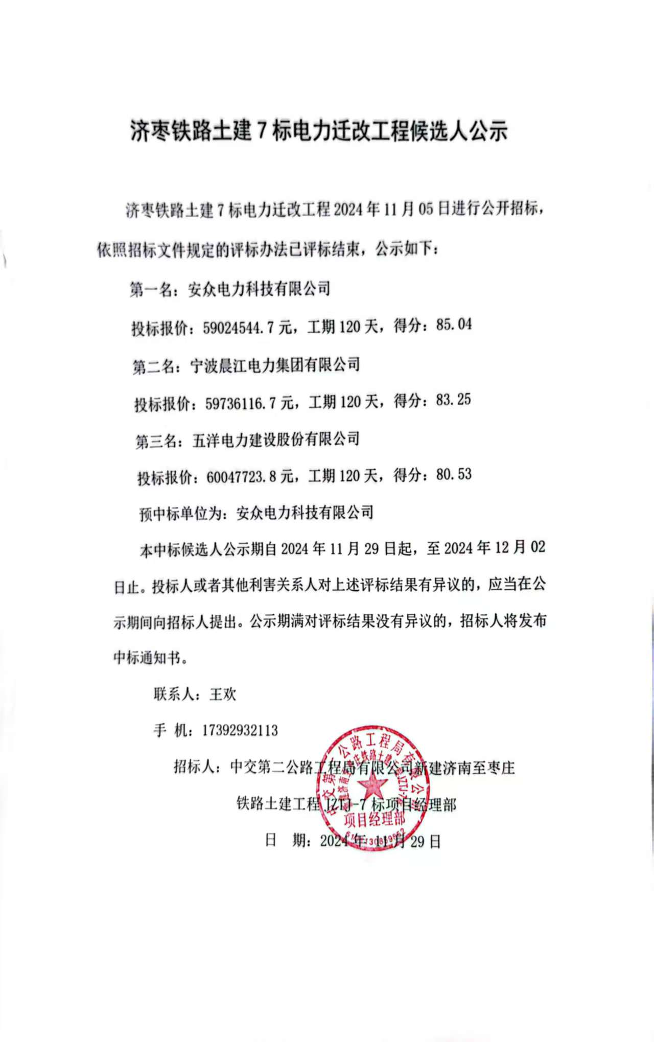 济枣铁路7标项目钢板桩围堰中标候选人公示