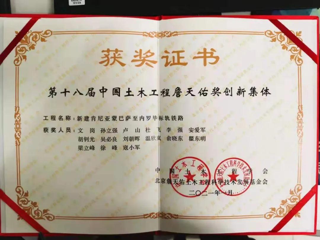 作为我国土木工程领域科技创新的最高荣誉奖,该奖项主要授予在科技创新(尤其是自主创新)和科技应用方面成绩显著的优秀土木工程建设项目,获奖项目充分体现“创新性”“先进性”和“权威性”。蒙内铁路项目获此殊荣,是对我们企业、工程建设人员锐意进取、自主创新的高度肯定,对弘扬科技创新精神、激励创新创造热情、推动行业科技进步发挥了引领示范作用。