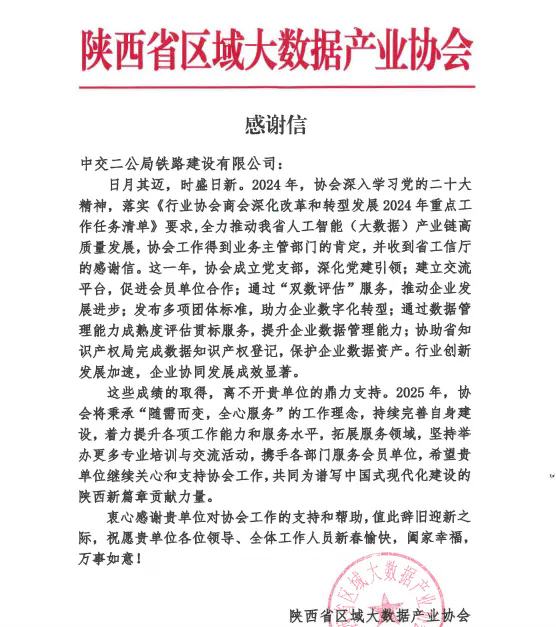 近日,陕西省区域大数据产业协会向公司发来感谢信,对公司在2024年所做出的支持表示高度赞扬和衷心感谢。